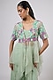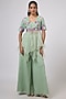 Featuring a blue handkerchief top in viscose organza base with floral hand embroidery. It is paired with sharara pants and a blouse. Accentuate it with delicate pearl or pastel stone jewellery and finish with a minimal clutch to keep the look light and graceful. Perfect for daytime festivities, family celebrations or elegant brunch events.