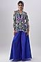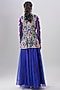 Featuring a blue jacket in net base with floral hand embroidery. It is paired with viscose organza sharara pants and a shantoon bustier. Accentuate it with delicate silver jhumkas or minimal stud earrings to keep the focus on the outfit?s rich colours. Ideal for festive brunches, intimate celebrations or evening events.