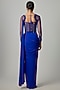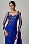 Featuring an electric blue draped gown saree in stretchable net base. Accentuate it with zircon dangler earrings, a clutch and block heels for sangeet, engagement or cocktail ceremony.