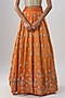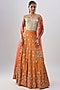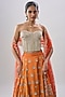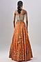 Featuring an orange lehenga in cotton silk base with metal hand embroidery. It is paired with a gold corset and a net embroidered dupatta. Accentuate it with statement jewellery and heels for a wedding, sangeet or engagement ceremony.