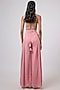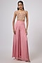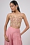 Featuring a gold corset in net base with cutwork hand embroidery. It is paired with pink viscose georgette peated sharara pants. Accentuate it with delicate pearl or pastel stone jewellery and finish with a minimal clutch to keep the look light and graceful. Perfect for daytime festivities, family celebrations or elegant brunch events.