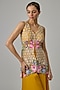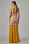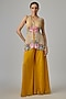 Featuring a yellow jacket in net and organza base with multi-colored hand and machine embroidery. It is paired with flared sharara pants. Accentuate it with statement earrings and heels for festive or wedding ceremonies.