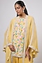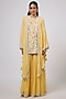 Featuring a yellow kurta in net base with floral hand embroidery. It is paired with viscose georgette sharara pants and a cape dupatta. Accentuate it with delicate silver jhumkas or minimal stud earrings to keep the focus on the outfit?s rich colours. Ideal for festive brunches, haldi ceremony or evening events.