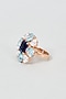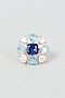 Featuring a white finish ring studded with swarovski zirconia and emerald cut blue stone, set in 92.5 sterling silver.