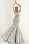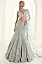 Featuring an ice blue fish-cut lehenga in net base with cutdana, sequins, pearl, thread and dori embroidery. It is paired with a bustier, a dupatta and a potli bag. Style it with zircon jewellery, soft curls and block heels, perfect for weddings, reception or sangeet ceremonies.