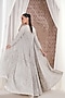 Featuring an ivory jacket in net base with pearl and sequins embellishments. It is paired with georgette embroidered trousers and a bustier. Style it with statement earrings, soft curls and block heels, perfect for engagement or sangeet ceremonies.