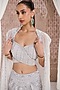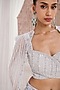 Featuring an ivory cape in net base with pearl and sequins embroidery. It is paired with a blouse and a skirt. Style it with statement earrings, soft curls and block heels, perfect for engagement or sangeet ceremonies.