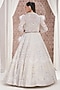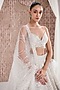 Featuring an ivory lehenga in organza base with sequins, pearl and feather embroidery. It is paired with a bustier, a net jacket, a dupatta and a potli bag. Style it with zircon jewellery, soft curls and block heels, perfect for weddings, reception or sangeet ceremonies.