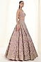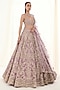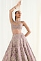 Featuring a mauve lehenga in georgette base with tush work. It is paired with a blouse and a net dupatta. Style it with statement earrings, soft curls and block heels, perfect for weddings or sangeet ceremonies.