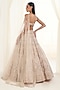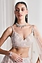 Featuring a powder pink lehenga in organza base with sequins, cutdana and nalki embroidery. It is paired with a blouse having an attached net dupatta and a potli. Style it with zircon jewellery, soft curls and block heels, perfect for weddings, reception or sangeet ceremonies.
