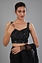 Featuring a black draped saree in crepe base with organza ruffles and embellishments. It is paired with a raw silk embellished blouse and a pallu. Style this designer set with chandbali earrings and heels for an engagement or any festive occasion.