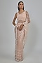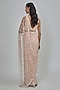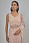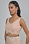 Featuring a blush pink saree in net base. It is paired with a raw silk blouse and a lycra underskirt. Accentuate it with statement jewellery and heels for a sangeet ceremony or weddings.