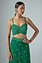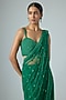 Featuring an emerald green draped saree in net base with embellished border detail and geometric boota motifs. It is paired with a raw silk embellished blouse. Accentuate it with dangler earrings and heels for a cocktail soirees, wedding or mehendi ceremony.