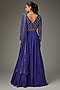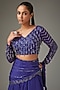 Featuring a pixie powder draped skirt in crepe base. It is paired a raw silk embellished blouse and a drape. Accentuate it with statement jewellery and heels for a wedding, sangeet or cocktail ceremony.