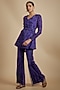 Featuring a pixie powder jacket in crepe base with embellishments. It is paired net embellished pants and a belt. Accentuate it with statement jewellery and heels for a festive occasion, sangeet or cocktail ceremony.