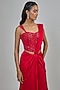 Featuring a red concept saree in crepe base. It is paired with a crepe drape and a raw silk blouse. Accentuate with diamond jewellery, metallic heels and a sleek clutch for a sophisticated look, perfect for receptions or cocktail events.
