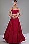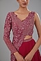 Featuring a red asymmetrical top in satin organza base with one-side stretch net sleeves and embellishments. It is paired with a bustier and a crepe skirt. Style this designer set with dangler earrings and heels for an engagement or cocktail ceremony.