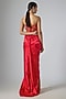 Featuring a red draped skirt saree in stretch satin base. It is paired with a raw silk and net corset, including a net detachable pallu drape. Accentuate it with dangler earrings and heels for a cocktail soirees, wedding or sangeet ceremony.