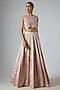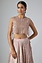 Featuring a rose gold skirt in crushed tissue base. It is paired with a crepe bustier and a net bib having pearl and zardosi embellishment. Accentuate it with dangler earrings and heels for a festive occasion, wedding or sangeet ceremony.