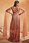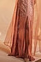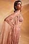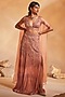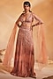 Featuring a light coral blouse in crushed organza base with hand embroidery. It is paired with a matching skirt.