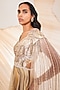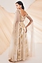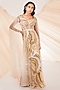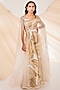 Featuring a mustard gown in organza base with cape sleeves, print and hand embellishments.