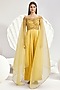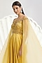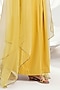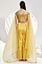 Featuring a yellow jumpsuit in satin and organza base with cape sleeves and wide-leg pleated trousers, including hand and machine embroidery. Accentuate with statement earrings and heels for a wedding or festive occasion.