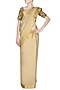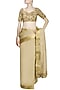 Featuring a golden saree, set in tussar moonga silk base. It is appliqued with zardozi thread embroidery, accented with a wide golden border. It comes along with a golden blouse festooned with zardozi thread embroidery and sequins in floral motifs all over the front and back.