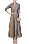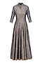 This set features a grey flared high neck anarkali kurta in raw silk base with gold tilla embroidery in geometric pattern all over the front, back and cuffs. It comes along with tilla embroidered net dupatta.