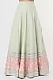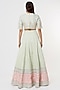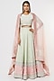 Featuring a mint lehenga in tussar and kota base with zardosi embroidery. It is paired with a matching blouse and a blush pink dupatta.