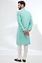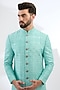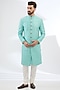 Featuring a blue sherwani in silk base. It is paired with churidar. Perfect wear for a wedding, engagement or sangeet ceremony, exuding charm and elegance.