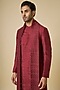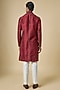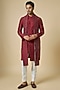 Featuring a brick red kurta in raw silk base. It is paired with pants and a stole. Style it with mojaris for a festive gathering, pooja ceremony or cultural celebrations.
