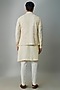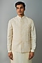 Featuring an ivory bundi jacket in raw silk base with embroidery. It is paired with a kurta and stretch cotton trousers. Perfect attire for a wedding or engagement ceremony, exuding traditional charm and elegance.