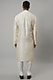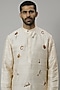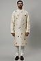 Featuring an ivory kurta in raw silk and katan silk base with embroidery. It is paired with churidar pants. Style it with mojaris for a grand festive celebration, sangeet or engagement ceremony.