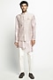 Featuring a lilac sadri bundi jacket in silk base with embroidery. It is paired with a kurta and white cotton trousers. Perfect wear for an engagement ceremony, exuding charm and elegance.