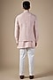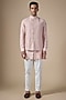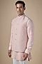 Featuring an onion pink nehru jacket in matka silk base with hand embroidery. It is paired with a dupion silk kurta and trousers. Accentuate it with pair of kolhapuris and a bracelet for a wedding or sangeet ceremony.