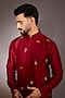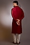 Featuring a red kurta in raw silk. It is paired with churidar pants. Perfect for a festive occasion or pooja ceremony, exuding traditional charm and timeless elegance.