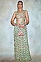 Featuring a mint green sharara saree in georgette and cotton silk base with floral print. It is paired with a matching blouse having embroidered sleeves and a blush pink triangle bag.