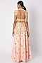 Presenting an elegant peach lehenga crafted in art georgette and cotton silk with exquisite 3D zardosi embroidery. The lehenga set is complemented with a contrasting blouse, a dupatta and a belt bag, making it the perfect outfit for a wedding, sangeet, engagement or bridesmaid look.