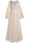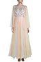 Featuring a pink anarkali in maska base with multi colored net rays embroidery. It is paired with matching churidar pants.