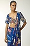 Featuring a blue skirt saree in crepe base with a slit and floral print. It is paired with a blouse having leaf print. Accentuate it with statement jewellery and heels for a cocktail or sangeet ceremony.