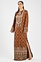 Featuring a caramel-colored kaftan in dola silk base with print. Accentuate it with kundan polki earrings and heels for festive occasions.