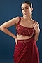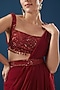 Featuring a crimson red layered ruffle saree in cotton silk and georgette base. It is paired with a blouse having diamond embroidery, an embroidered belt and a bag. Style it with a necklace and earrings for a wedding or reception ceremony.