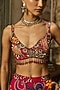 DiyaRajvvir features a deep red blouse in crepe and georgette base with coral veil print. It is paired with a printed skirt and a potli bag. Style it with meenakari earrings, heels and a clutch for sangeet, roka, engagement or wedding festivities.