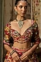 DiyaRajvvir features a deep red lehenga in crepe and georgette base with coral veil print. It is paired with a blouse, a can-can and a printed dupatta. Style this lehenga with kundan jewellery, soft curls and embellished heels for an elegant look, perfect for engagement ceremonies, sangeet nights or daytime wedding functions.