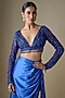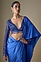 Featuring an electric blue dhoti skirt saree in tulle and armani satin base. It is paired with an embellished blouse having a deep neck. Accentuate it with zircon jewellery and heels for a sangeet or wedding ceremony.
