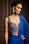 Featuring an electric blue pre-draped skirt saree in tulle and georgette base. It is paired with an embellished blouse. Accentuate it with diamond jewellery, a clutch and metallic heels for a red carpet, sangeet or engagement ceremonies.