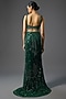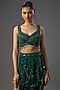 Featuring an emerald green trail skirt in satin lycra and shantoon base with embellishments. It is paired with an embellished blouse. Accentuate it with statement jewellery and heels for a cocktail or sangeet ceremony.