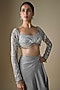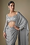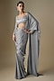 Featuring a light grey pre-draped skirt saree in tulle and armani satin base. It is paired with an embellished blouse. Accentuate it with zircon jewellery and heels for a sangeet or cocktail ceremony.