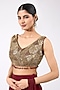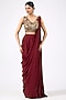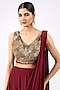 Featuring a maroon skirt saree in tulle and crepe base. It is paired with a gold embroidered blouse. Accentuate it with heels and statement earrings for a cocktail night, wedding reception, or festive soiree.