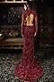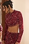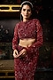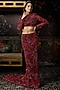 Featuring a maroon and red trail skirt in satin lycra and shantoon base with embellishments. It is paired with an embellished blouse having a cropped neckline. Accentuate it with statement jewellery and heels for a cocktail or sangeet ceremony.